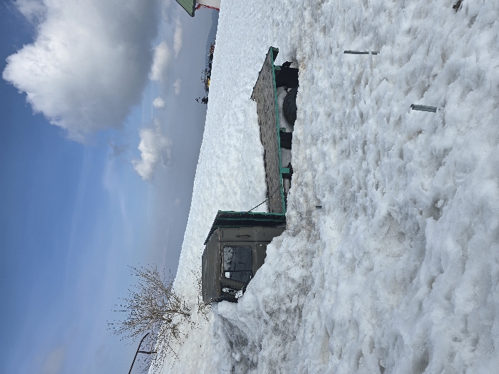 The image depicts a snowy mountain landscape in Panichishte, Bulgaria, under a blue sky with scattered white cumulus clouds. In the midground, an olive-drab utility vehicle, consistent with a flatbed truck, is deeply embedded in textured white snow. The cab section, featuring a window and a dark panel, is visible on the left, while the flatbed extends to the right, with only its upper surfaces exposed above the snowline. To the upper left, a small, bare deciduous tree stands on a snow-covered bank, adjacent to a dark metal railing. In the immediate foreground, several short, metallic posts protrude vertically from the snow. On a distant snowy ridge to the upper right, multiple snowmobiles are parked. Adjacent to these, a building with a green roof and a red structural support is partially visible. A hazy mountain range is discernible on the distant horizon beneath the clouds. No people are present in the scene.