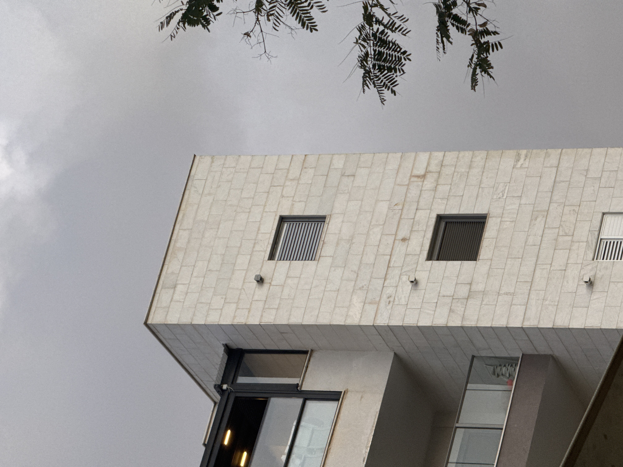 A low-angle, eye-level shot captures the upper portion of a modern building against an overcast sky in Bat Yam, Israel. The building's facade is constructed of rectangular, beige-toned stone tiles. Three dark, square windows are visible across the top section, each appearing to have either blinds or some form of screening. Below, there is a set of larger windows with dark frames, including one that is partially open, revealing a bright yellow light source inside. Additional, smaller windows are visible. In the upper portion of the frame, sparse green leaves hang down from thin branches, creating a visual element in contrast to the angular architecture. The sky is a uniform light gray, suggesting an overcast day. No people or other subjects are immediately apparent in the frame.