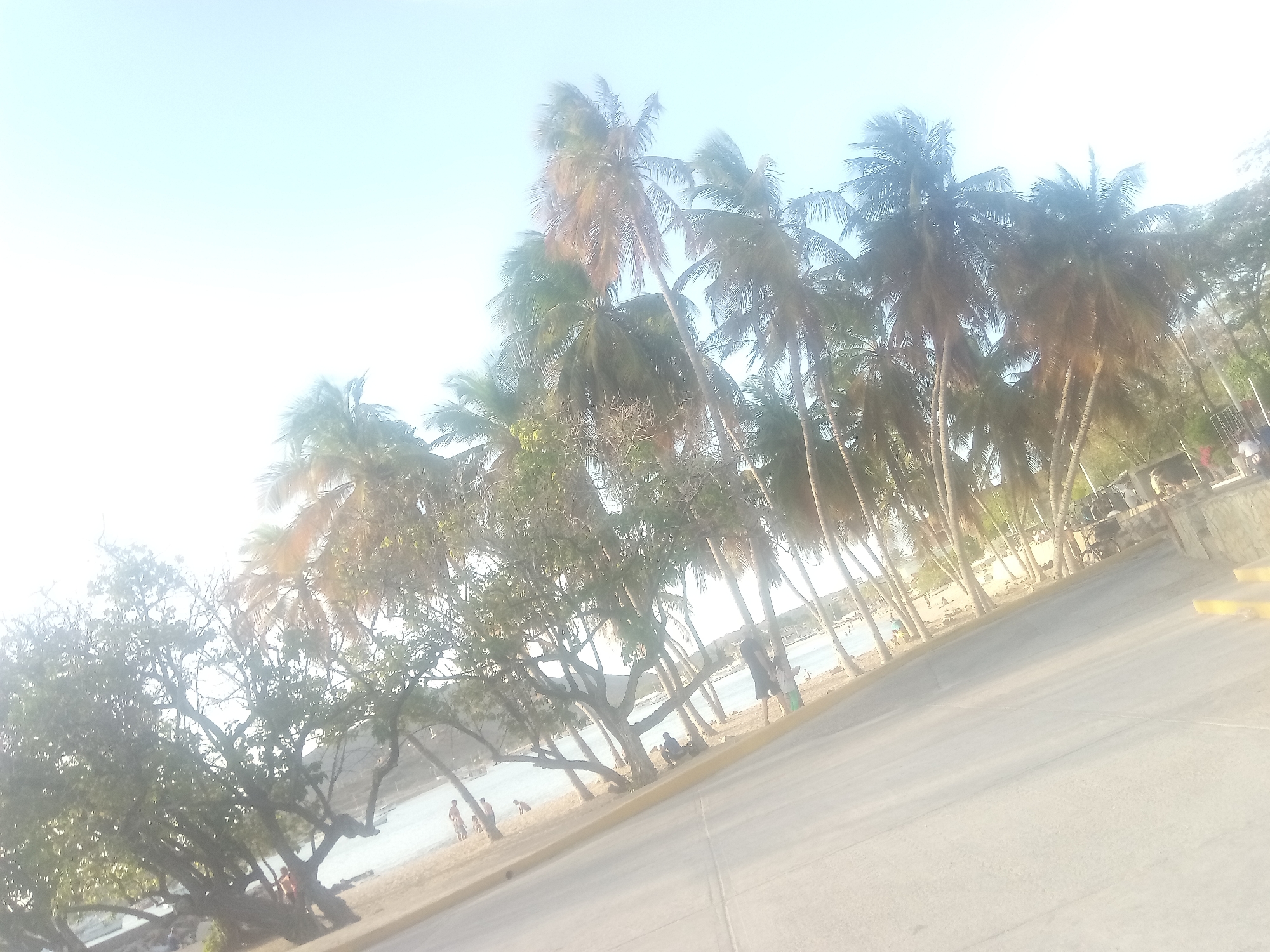 beach scene in Juan Griego, Venezuela, characterized by numerous palm trees and deciduous trees. A paved surface or road occupies the foreground, with yellow painted road markings visible. In the background, the beach is populated by several individuals, some standing or walking along the shoreline and others sitting beneath the trees. The bay is dotted with small boats and a few structures on the hill in the distance. The overall scene is bathed in bright daylight, and the image has a slightly washed-out appearance.