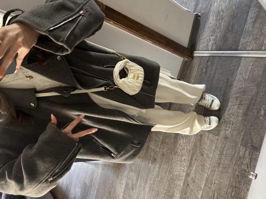 An individual stands for a mirror selfie indoors in Yerevan, Armenia. The person is attired in a dark gray wool-blend biker jacket featuring zippered sleeves and pockets, a white long-sleeved top, and cream-colored relaxed-fit trousers. White and silver low-top sneakers are worn on the feet. A small, pleated white Miu Miu mini-bag with gold lettering and a thin gold chain strap is worn across the body. A gold chain necklace with a small pendant is visible. The person's right hand is raised, displaying a "V" sign, with fingers featuring light-tipped nail polish. A smartphone is held by the left hand, visible in the reflection. The floor is covered with dark gray wood-grain laminate, and a portion of a mirror with a brown wooden frame is visible on the right.