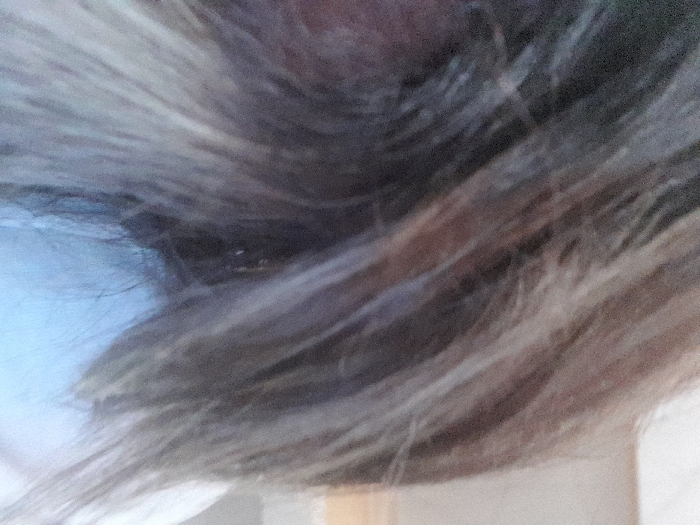 The image displays a close-up, out-of-focus view of an individual, situated within the city of Meknes, Morocco. The predominant feature is a mass of long, streaked hair, showing a mixture of brown, dark blonde, and grey tones, cascading across the frame from the upper-left to the lower-right. On the far-left edge, a dark, blurry area suggests a partial, indistinct portion of a face or ear, heavily obscured by the hair. A segment of a light-colored garment, consistent with a white or light blue shirt, is visible on the lower-right, beneath the hair. The background is uniformly blurred and featureless, indicative of an indoor setting with soft, ambient illumination, offering no specific environmental details. No discernible actions or interactions are present.