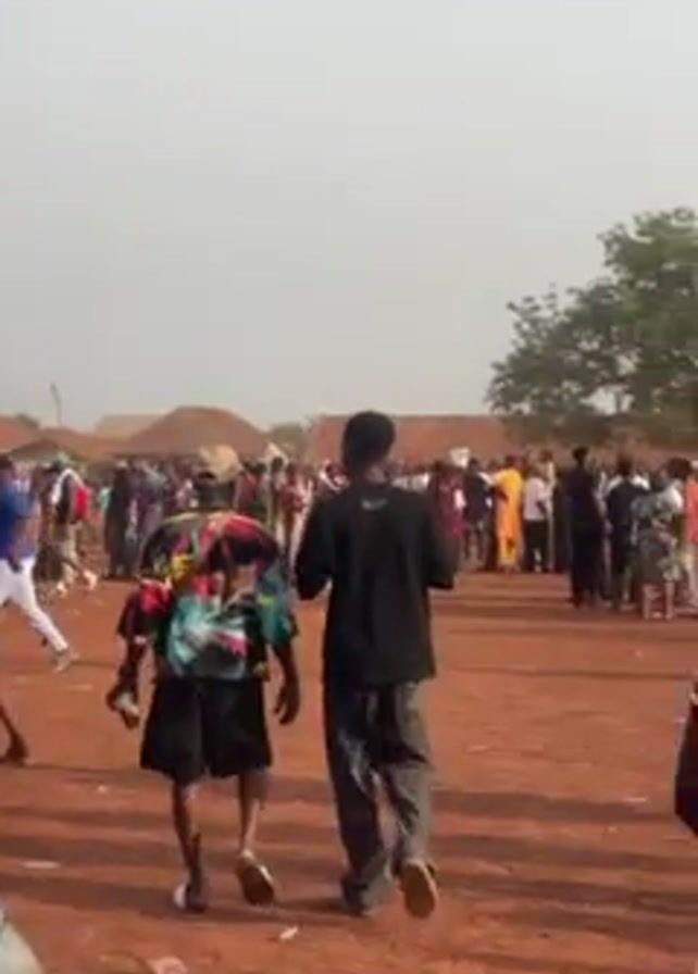crowded outdoor event on a dirt field. Numerous people are milling around, wearing a variety of clothing. Some are walking towards a group of tents, while others appear to be moving toward or from a stage area with a yellow screen. There are trees visible in the background, and the sky is overcast.
