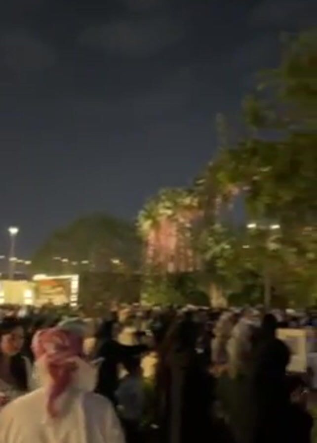 The video depicts a densely packed crowd gathered outdoors at night. Many are dressed in traditional Middle Eastern attire. The environment includes lush greenery, with trees and plants visible around the crowd, some adorned with string lights. A building in the background appears to be illuminated with pink light. The atmosphere is active with people moving and a sense of collective engagement in an event. A song is playing in the background.
