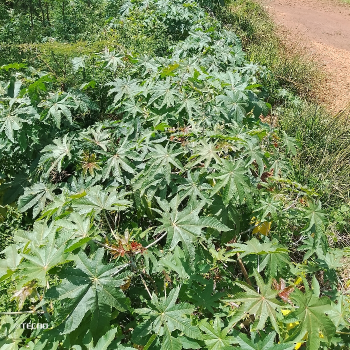 The image depicts an outdoor scene in Kasunguni, Kenya, characterized by dense vegetation and a dirt path. The primary subjects are numerous castor bean plants (Ricinus communis) with large, deeply lobed green leaves, which fill the foreground and extend into the midground. Several plants show signs of reddish-brown stems, new growth, and developing seed pods interspersed among the foliage. To the right, a section of an unpaved, light brown dirt path is visible, bordered by patches of dry grass and more green vegetation. Additional green trees and foliage are present in the distant background. No people, animals, or man-made objects other than the implied path are discernible. The scene is illuminated by natural daylight. A "TECNO" watermark is present in the lower-left corner of the image.