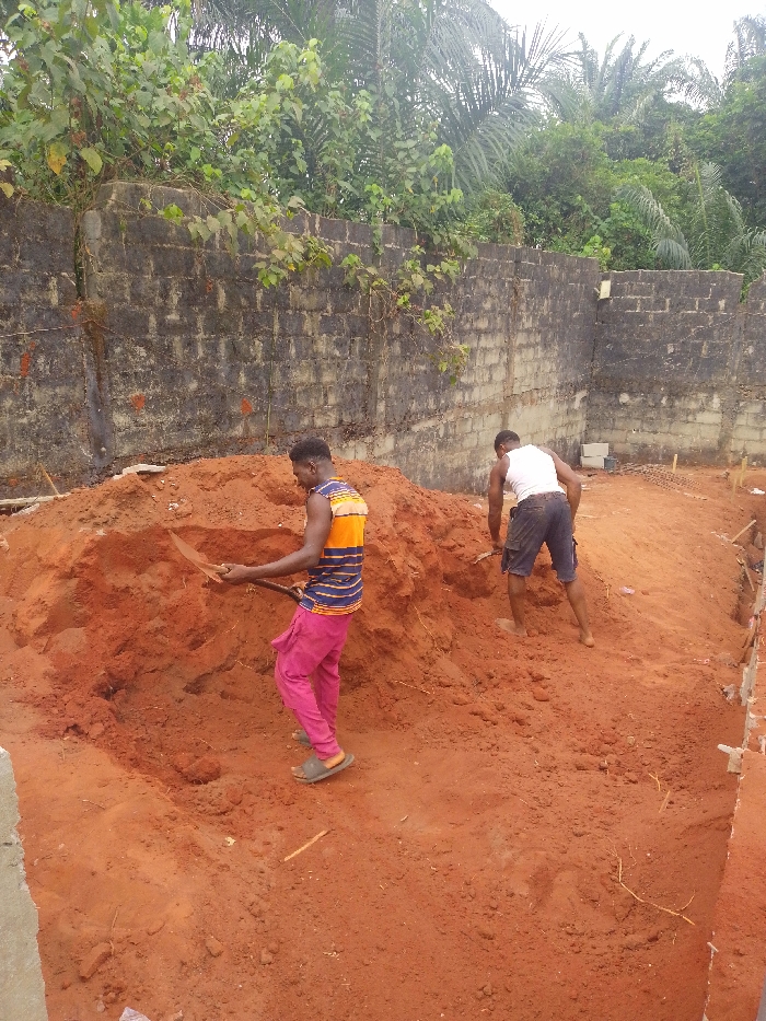 The image depicts two adult males engaged in manual excavation within an outdoor construction site in Alor, Nigeria
