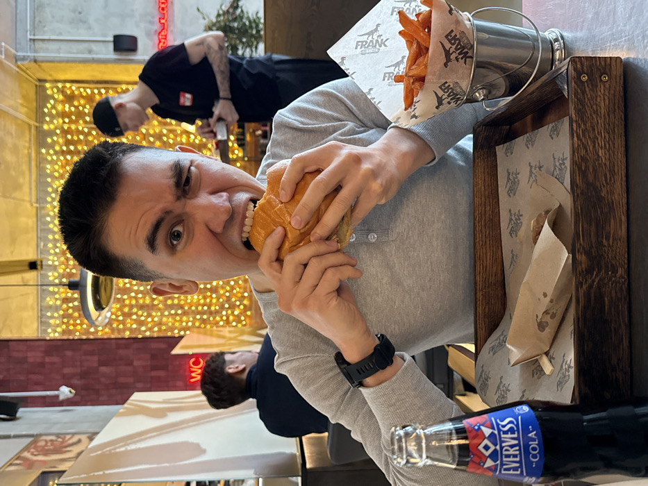 The image captures an indoor scene within the "Frank by Basta" restaurant, located at Prospekt Yamasheva, 46, Kazan, Republic of Tatarstan, Russia. In the foreground, a male subject with short dark hair, wearing a light gray long-sleeved Henley shirt and a black smartwatch on his left wrist, is depicted actively biting into a hamburger. He is looking directly at the camera with a wide-eyed, expressive facial grimace. On the table in front of him, a wooden tray contains a piece of "FRANK" branded parchment paper, a brown paper wrapper, a glass bottle of "EVERVESS 'COLA'", and a silver metal bucket filled with orange-colored sweet potato fries, also lined with "FRANK" branded paper. In the mid-ground to the left, another male subject is seated with his back to the camera, wearing a dark shirt. In the background to the right, a male staff member, identified by a black t-shirt, backward black baseball cap, and visible forearm tattoos, stands and appears to be occupied with tasks near a counter. The restaurant interior features light-colored walls, sections with red brick-like paneling, and a prominent wall illuminated by numerous warm-toned string lights, creating a bokeh effect. A red neon "WC" sign is affixed to a red panel wall. A white security camera is mounted on the ceiling to the left. The setting is characteristic of a casual dining establishment.
