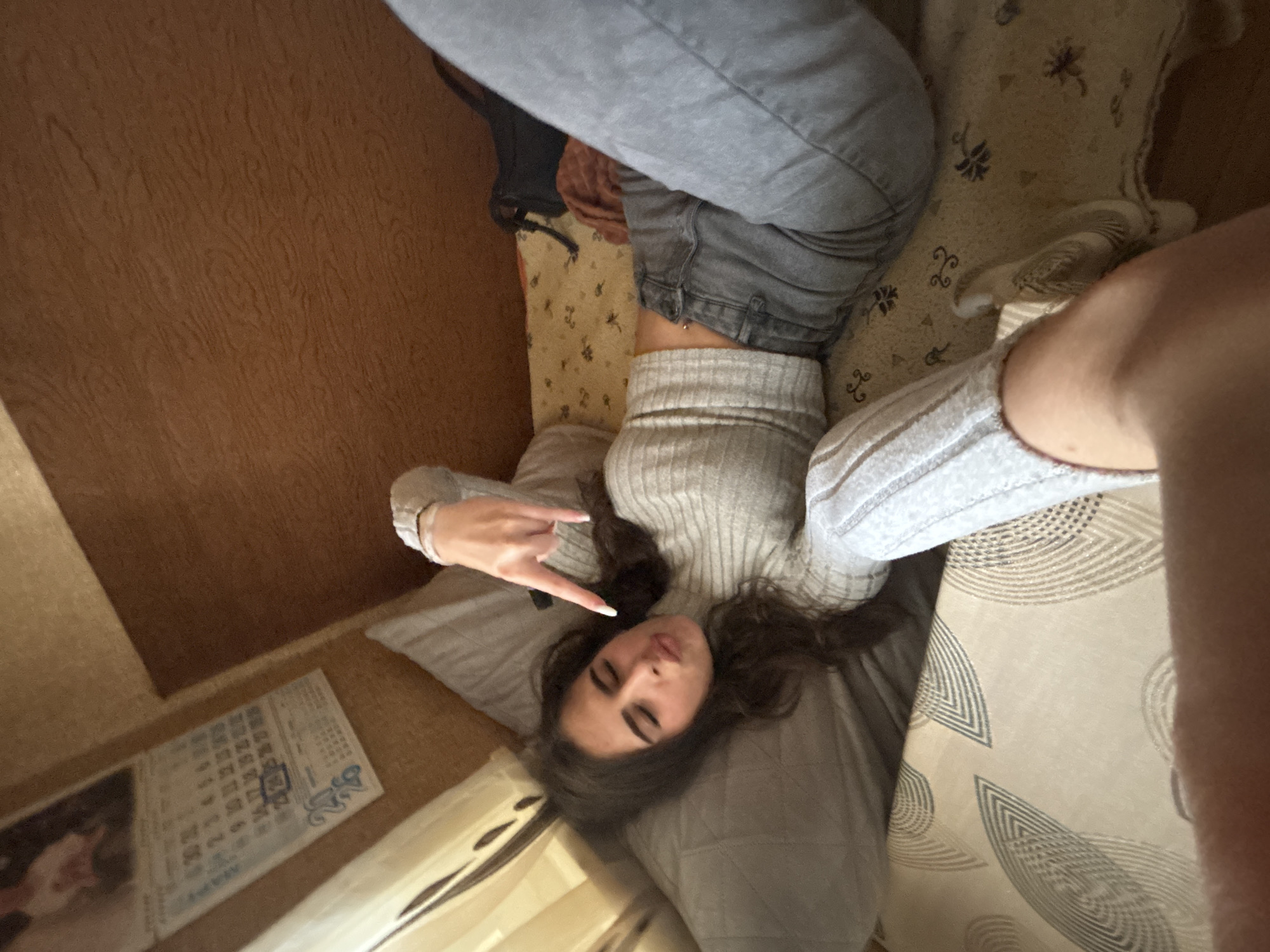 A female subject lies on her back on a patterned bed or couch in an indoor setting, stated to be Yambol, Bulgaria. Her dark, long hair is spread on a gray pillow. She wears a light gray ribbed long-sleeved crop top, revealing her midriff, and light gray jeans. Her left arm is raised, forming a "rock on" hand gesture with extended index and pinky fingers. Her fingernails are white and pointed. Her eyes are closed, and her lips are pursed into a "duck face." A small, circular charm on an ankle bracelet is visible on her left ankle. A dark bag is positioned behind her legs on the bed/couch. The wall behind her is covered in a light brown material with a wood-grain pattern. A wall calendar for the year 2023, featuring an image at the top and numbered dates (with "23" appearing highlighted), is affixed to the wall above the pillow. A light-colored curtain is partially visible on the far left. A portion of a bare leg, presumably belonging to the photographer, extends into the bottom right foreground.