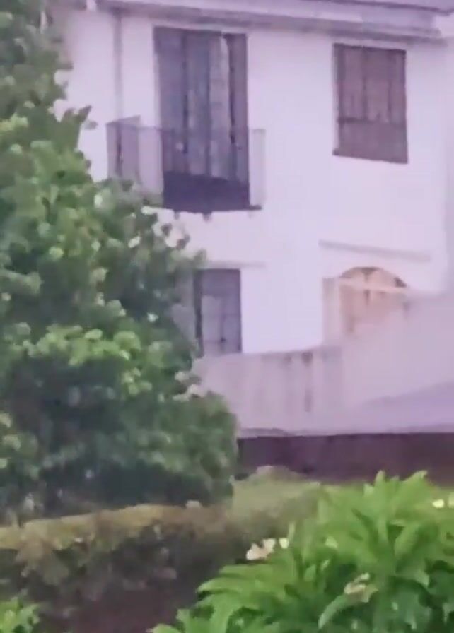 white two-story building with a gray tile roof, partially obscured by greenery in the foreground. The building has a small balcony with a black railing, and several windows, some of which appear to have closed shutters. The view is slightly blurred, suggesting the video may have been taken from a distance or under imperfect lighting conditions. It appears to be a rainy or overcast day.