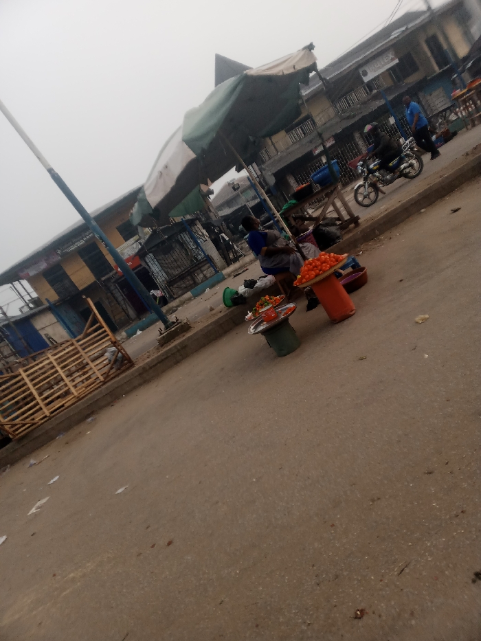 A street scene shows a woman selling tomatoes under a large green and white sunshade. The tomatoes are displayed on raised surfaces, one orange and one green. Buildings line the street, some with visible shops. A person rides a motorcycle in the background, and another person stands nearby. Debris litters the road, and a partially constructed wooden structure sits along the curb. The sky is overcast, and the photo has a slightly blurred appearance.