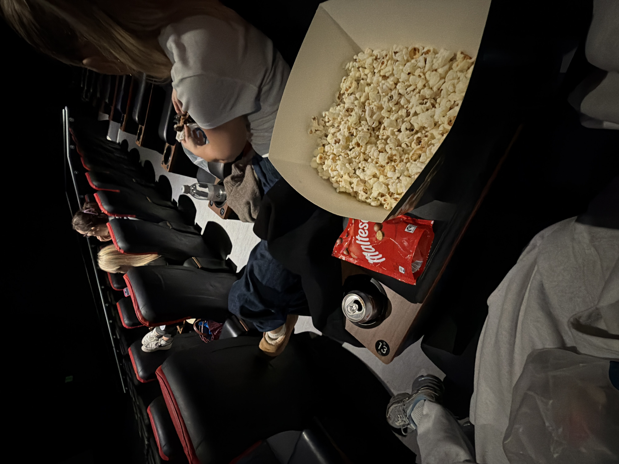 The scene depicts the interior of a darkened cinema auditorium in London, United Kingdom. Multiple individuals occupy tiered, black cinema seats with red accents, each equipped with small, dark wooden-effect side tables and integrated cup holders. In the immediate foreground, a large, white rectangular cardboard container is filled with popped popcorn. To its left, on a side table displaying the partial white numbering "13," sits an open aluminum beverage can and a red plastic bag of "Maltesers" confectionery. Further left, in the lowest part of the frame, a person's feet, clad in grey and light blue athletic shoes and white socks, are visible. To the right of the popcorn, the partially visible back of a person with blonde hair, wearing a white t-shirt, is observed. Their right arm is engaged in an indistinct action near a small brown knitted item draped on an adjacent side table, which also holds a clear plastic water bottle. Further left in the mid-ground, a person's lower legs are visible, dressed in dark blue jeans and resting on the seat in front. They are wearing tan-colored, open-backed slippers with white fur lining. A red or purple bag rests on the floor next to their seat. Multiple other patrons are seated in rows further back, mostly visible from behind, including a person with dark hair secured with a pink scrunchie. The overall environment is dimly lit, consistent with a cinema during a screening or pre-show.