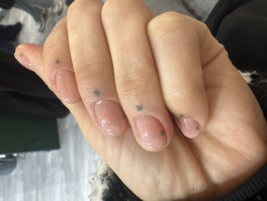 Unknown location in the city of Unknown, Unknown. A close-up, high-angle photograph captures a light-skinned human left hand in a slightly curled, relaxed position. All visible fingernails are coated with a glossy, translucent light-pink gel polish. Five distinct, small, dark grey or black circular spots, each approximately 1-2mm in diameter, are present on the skin of the fingers. Specifically, one spot is located on the distal phalanx of the thumb, one on the distal phalanx of the index finger, one on the middle phalanx of the middle finger, one on the distal phalanx of the ring finger, and one on the distal phalanx of the pinky finger. The hand appears to be resting against or within dark, possibly textured clothing in the foreground, specifically a black and white patterned fabric on the lower left and plain black fabric on the right. The background is out of focus, revealing a light-colored floor, a blurred dark green vertical object, and indistinct figures of individuals wearing light-colored footwear, indicative of an indoor public or commercial environment.