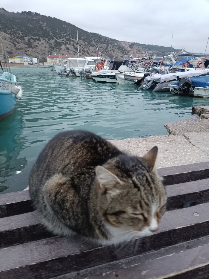 A tabby cat rests on a dark wooden bench. In the background, a harbor scene unfolds with various boats docked along a calm, turquoise body of water. Rolling hills, dotted with trees, rise in the distance under an overcast sky. The overall scene evokes a sense of tranquility and the quiet, everyday life by the sea.