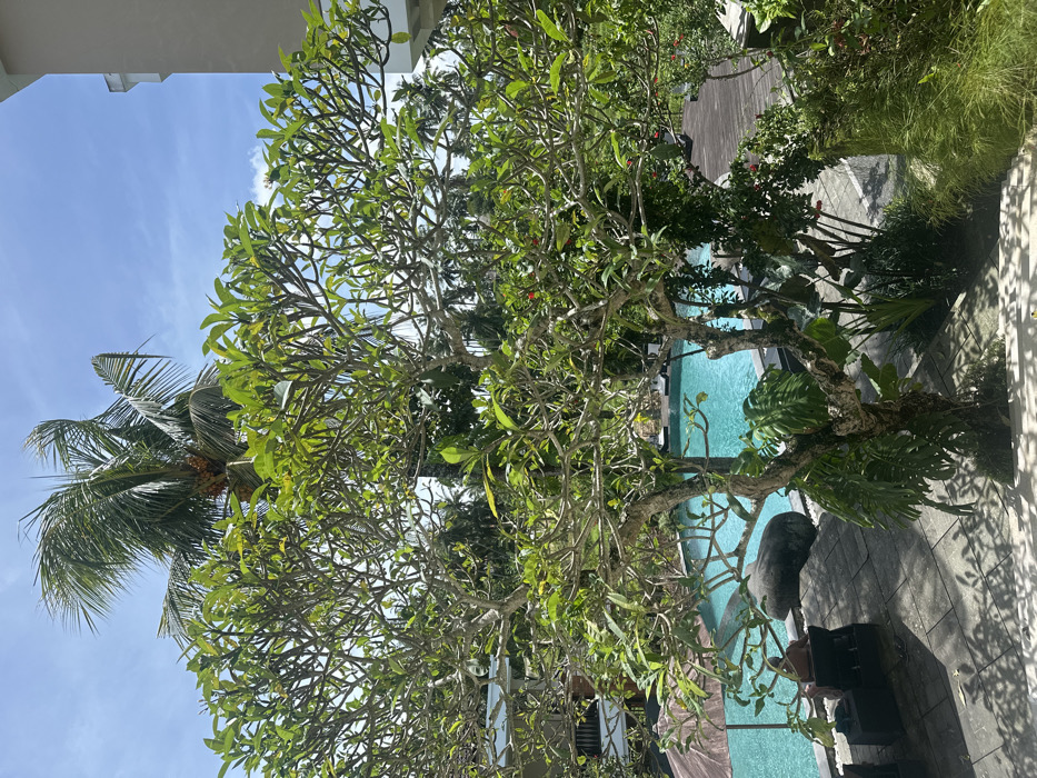 A lush, vibrant scene unfolds with a prominent tree in the foreground, its branches reaching toward a bright blue sky. A palm tree adds tropical flair. A sparkling turquoise swimming pool nestles amidst greenery. The scene is bathed in warm sunlight, and architectural elements, possibly a building, frame the upper edge of the shot. The setting evokes a sense of relaxation and tropical escape.