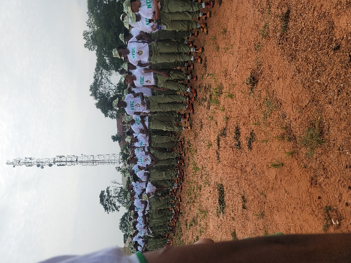 A long line of people in white shirts, green pants, hats, and brown boots stand in formation. The shirts have "NYSC" printed on them. The people are standing on red dirt. A tall communications tower stands behind them. The sky is overcast and gray. Some trees are also visible in the background.