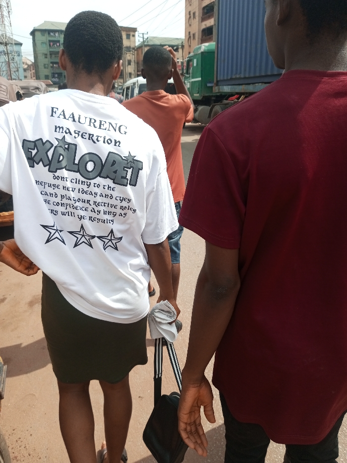 The image depicts a street scene in Onitsha, Nigeria, under daylight conditions. Three individuals are prominently featured, viewed from behind. In the immediate foreground on the right, a person wears a maroon short-sleeved t-shirt and dark trousers; their right arm is visible with an open hand. To their left, a second person, positioned slightly further back, wears a white short-sleeved t-shirt, an olive green knee-length skirt, and light-colored flip-flops. The white t-shirt bears multiple lines of black text and graphics on the back: "FAAURENG" at the top, followed by "masertion", then a large stylized "EXPLORET" with a star. Below this, smaller text reads "dont cliny to the refuse new ideas and eyes cand play your rective roles he confidence as long as rs will ye results". Three black outline stars are positioned near the bottom of the t-shirt. This individual holds a black bag with a black and white striped strap, along with a folded white cloth, in their right hand. Further back in the center, a third person wears an orange short-sleeved t-shirt and blue shorts. Their left hand is raised to the back of their head or neck. The ground surface is a reddish-brown pavement or asphalt. In the background, urban infrastructure is visible, including multi-story buildings with brownish facades. Vehicular traffic includes a large blue shipping container atop a green truck chassis, positioned behind the central figure, and a partially visible white van or bus to the left of the scene. Overhead power lines traverse the sky above the buildings.