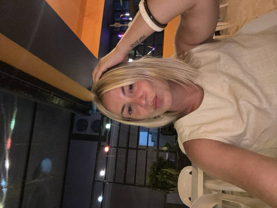 A blonde-haired female subject, appearing in her 20s or 30s, is centered in a medium shot, looking directly at the camera with pursed lips