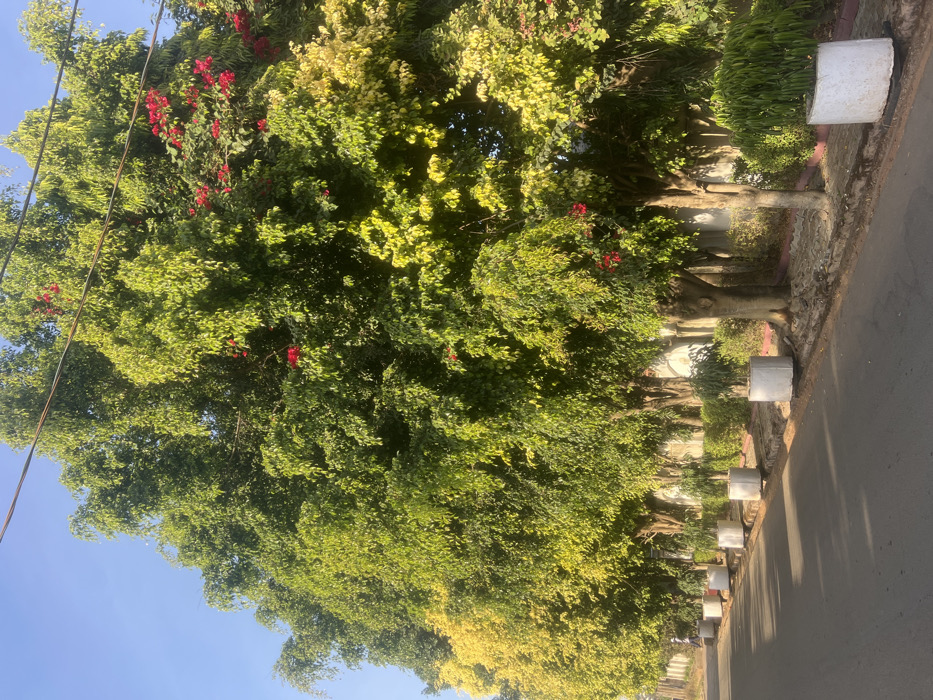 This image depicts a street scene in Jos, Nigeria, under a clear, light blue sky. A long line of mature trees with dense green foliage, interspersed with vibrant red flowering bougainvillea, flanks the right side of an asphalt road. Elongated shadows from these trees stretch across the road, indicating bright sunlight. Along the verge between the trees and the road, a series of seven or more white, cylindrical concrete planters containing green shrubbery are uniformly spaced. Behind these planters, a low, dense green hedge borders a darker, partially visible wall. On the left side of the asphalt road, in the far distance, a single individual on a bicycle or small motorcycle is faintly visible, moving away from the viewer. Thin power lines traverse horizontally across the upper portion of the frame.