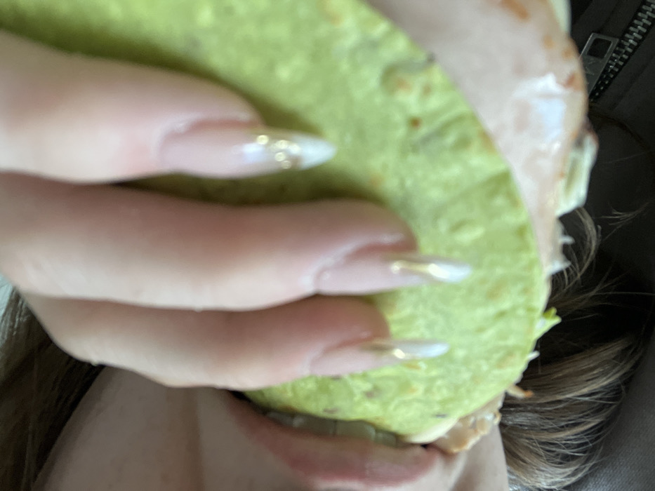 A person holds a large, green sandwich close to their face, biting into it with their lips slightly parted. Three fingers, adorned with long, pointed nails featuring gold accents, are visible holding the sandwich. The filling of the sandwich appears to be avocado or a similar green spread. A glimpse of the person's hair, styled with brown highlights, is visible near the bottom right. The backdrop includes what seems to be a gray or dark-colored jacket.