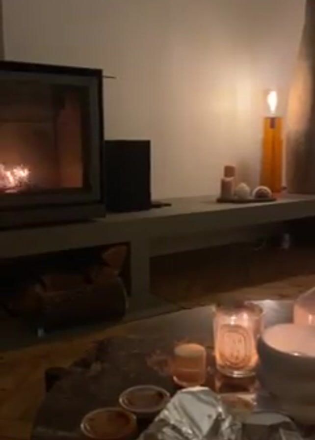 The camera frames a cozy living room scene. A modern fireplace with a glass front contains burning logs. Below, in a wooden crate, are logs. Next to the fireplace is a black speaker. On a long, grey console table sit two lit candles, small decorative items, and a tall orange lamp. In the foreground, a round marble coffee table is cluttered with various items: food containers, foil wrappers, and several lit candles, including one with the Diptyque brand label visible. The lighting is dim, emphasizing the warm glow of the fire and candles. The floor is hardwood.