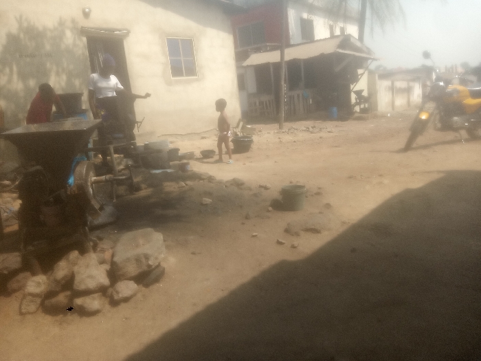 An outdoor scene in the city of Unknown, Unknown, depicts an unpaved, dusty ground area with multiple individuals and structures under bright daylight. In the left foreground, a large, dark industrial grinding or milling machine with a hopper is operational or being prepared, surrounded by several large rocks. Two adults interact with this machine: one person in a red top is bent over the hopper, while another in a white t-shirt and dark head covering stands upright nearby. To their right, a young child, appearing to be a toddler, stands shirtless in light-colored shorts, observing the activity. Behind this group is a single-story building with light-colored walls, a dark door, and a single window. In the midground, a dark bucket rests on the ground. Towards the right background, a yellow motorcycle is present, with the lower legs of a person visible nearby. Further in the background, a two-story building with a red upper section and a ground-level covered structure with a corrugated roof is visible, along with other distant structures and sparse vegetation. A large shadow extends across the lower right portion of the frame.