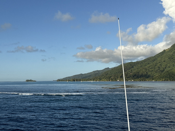 The image presents a panoramic coastal scene in Fa'a'ā, French Polynesia, under a bright blue sky dotted with scattered white cumulus clouds. The perspective is from a low vantage point, indicated by a white pole with a black tip extending diagonally from the bottom center-right towards the upper center-right of the frame. The foreground features choppy, dark blue ocean water with a prominent white-capped wave breaking horizontally across the mid-left portion. In the midground, a small, densely vegetated islet is visible on the far left, surrounded by lighter blue, calmer waters. Along the distant shoreline to the right, several white sailboats are anchored or moored in a lagoon characterized by varying shades of light blue and turquoise, indicative of shallow areas or reef structures. The background is dominated by a long, steep, and heavily forested mountain range covered in lush green tropical vegetation. Scattered small, white architectural structures are discernible at the base of the mountains along the coast. No individuals are visible.