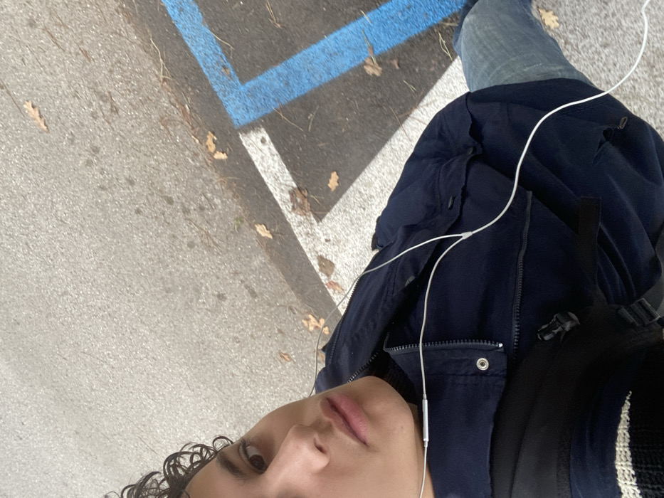 An overhead-angle image captures a young male in Rimini, Italy, partially visible on the left side of the frame. He has dark, curly hair and is looking directly at the viewer. He wears a dark blue zipped jacket over a dark inner layer, blue denim jeans, and a black backpack, a buckle of which is visible on his left shoulder. White wired earphones are positioned in his ears, with the wires extending across his chest. The subject stands on an asphalt surface marked with white and blue painted lines, indicating a parking area or roadside. Scattered dry, brown leaves are visible on the asphalt surface.