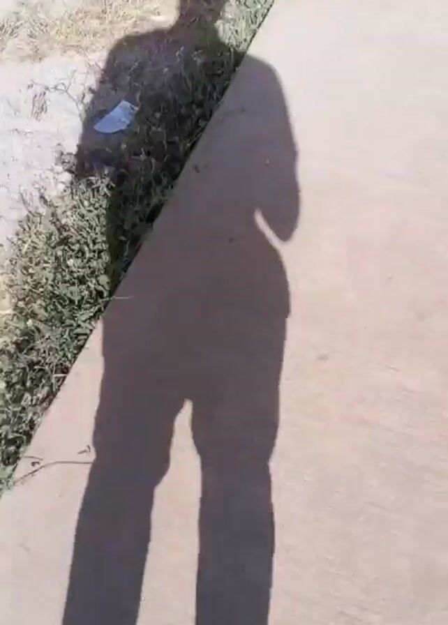 shadow of a person walking on a concrete sidewalk on a sunny day. The person is wearing a light-colored sandal. The shadow indicates the person is holding something small in their hand, possibly a phone. A patch of dirt and grass runs alongside the sidewalk. The camera is angled downward, focused on the ground and the shadow.