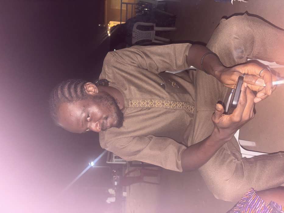 A man with dark skin, a beard, and braided hair sits outdoors at night. He wears a brown shirt with patterned embroidery and matching pants. He's looking down and holding a dark smartphone in his hands. A thin silver bracelet adorns his left wrist, and he has rings on his fingers. In the background, there are white plastic chairs and a faint light source, possibly a street lamp. The lower left of the image has a soft pink hue.