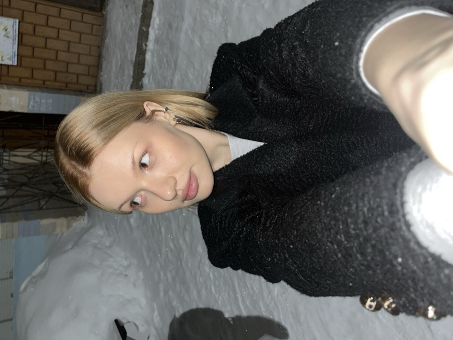 The image depicts a young woman in an outdoor urban environment in Chaikovsky, Russia, during winter. The ground is heavily covered with snow. The woman, with light blonde hair parted in the middle and a fair complexion, occupies the foreground. She is dressed in a dark, textured coat worn over a light grey garment, with several small, metallic decorative elements visible near the cuff of her left sleeve. Multiple small metallic earrings adorn her visible left ear. Her right arm is extended, suggesting a selfie pose, and her gaze is directed upwards and to her left. In the background, large snowdrifts are prominent. To the far left, a light-colored building with some blue elements is partially visible behind a snowdrift. To the right, a building facade with light brown paneling or brickwork and a dark metal grate are present. An indistinct dark shape is visible on the snow-covered ground in the lower-left background. The scene is illuminated by ambient artificial lighting, indicating nighttime conditions.