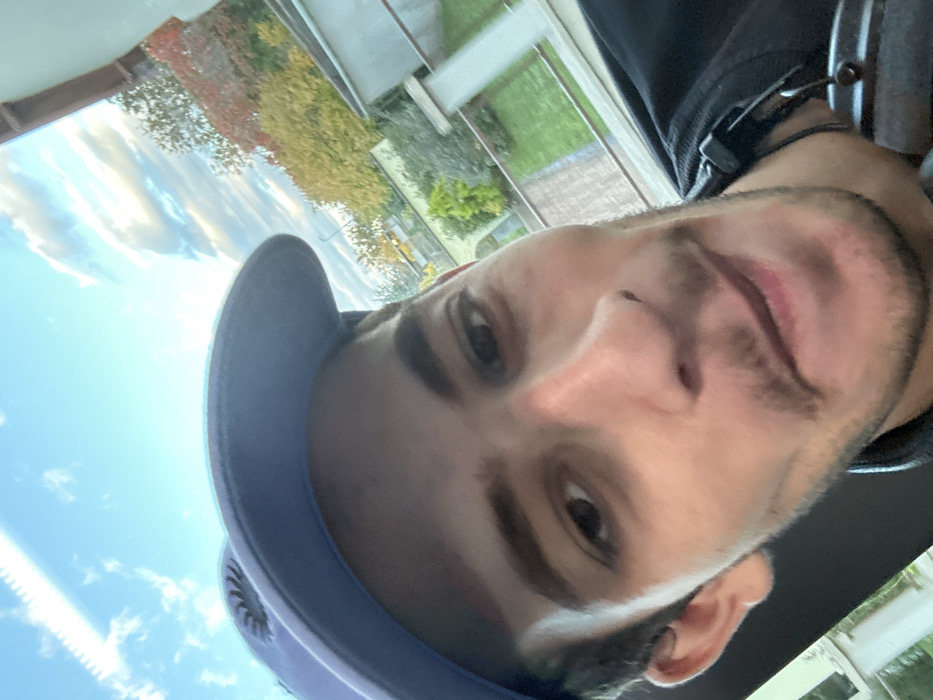 A close-up, upward-angled selfie depicts a male individual wearing a light blue baseball cap with a dark circular emblem and a dark-colored garment, with headphones resting around his neck
