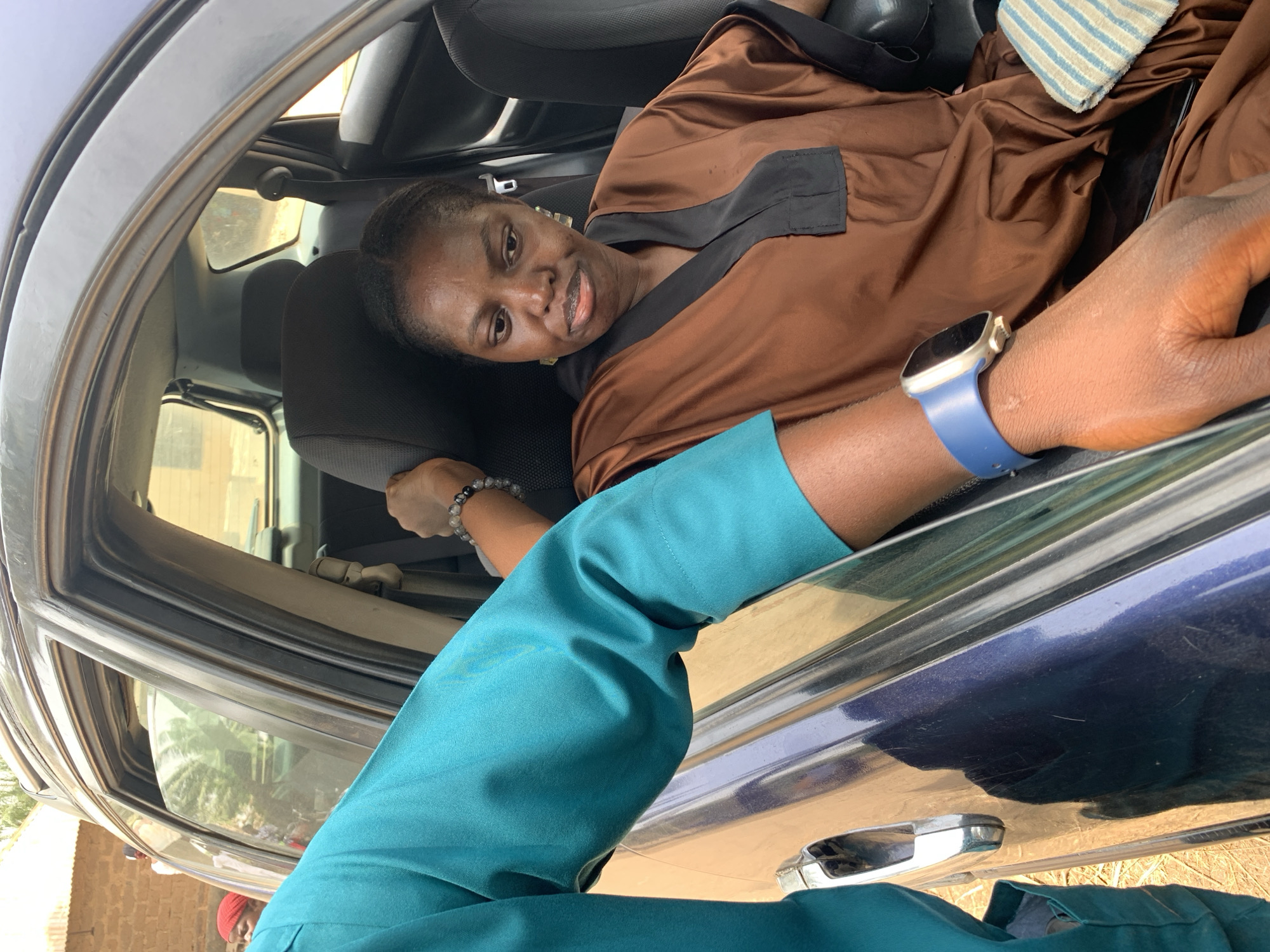 The scene depicts an outdoor interaction in Washo, Nigeria, involving a dark-colored vehicle with an open front passenger door. A female subject, with dark hair pulled back and wearing a brown and black kaftan-style garment, is seated in the front passenger seat. She has light-colored earrings and a beaded bracelet on her left wrist. Her expression is neutral, with a slight downturn at the corners of her mouth. Partially obscured by the car's interior, a striped blue and white cloth rests on her lap or the seat beside her. A male subject's upper body and arms are visible in the foreground. He is wearing a teal/turquoise long-sleeved shirt. His left arm, adorned with a blue smartwatch, rests on the exterior of the car's open door frame. His right arm extends into the vehicle's interior, positioned near the female subject's headrest, with his hand near the top of the seat. The car's exterior appears dark blue with visible scratches. In the background, a light-colored building with brick or mud walls is visible, along with sparse vegetation and a person wearing a red head covering. The ground is a light brown, earthy tone, indicating an unpaved outdoor environment under daylight conditions.