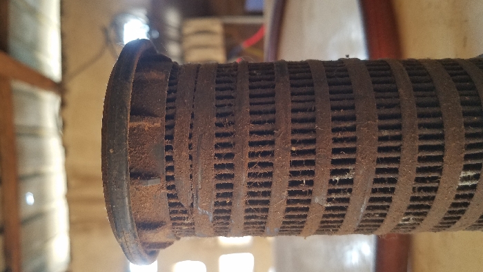 A cylindrical, dirty, and porous object is positioned in the foreground