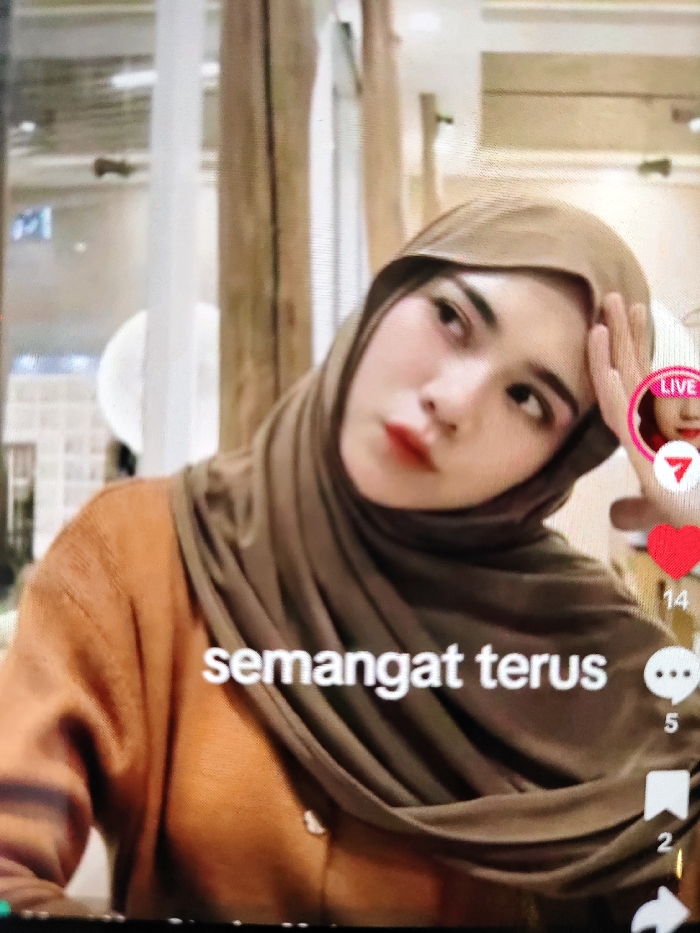 A woman wearing a brown hijab and a brown sweater is featured in a live video