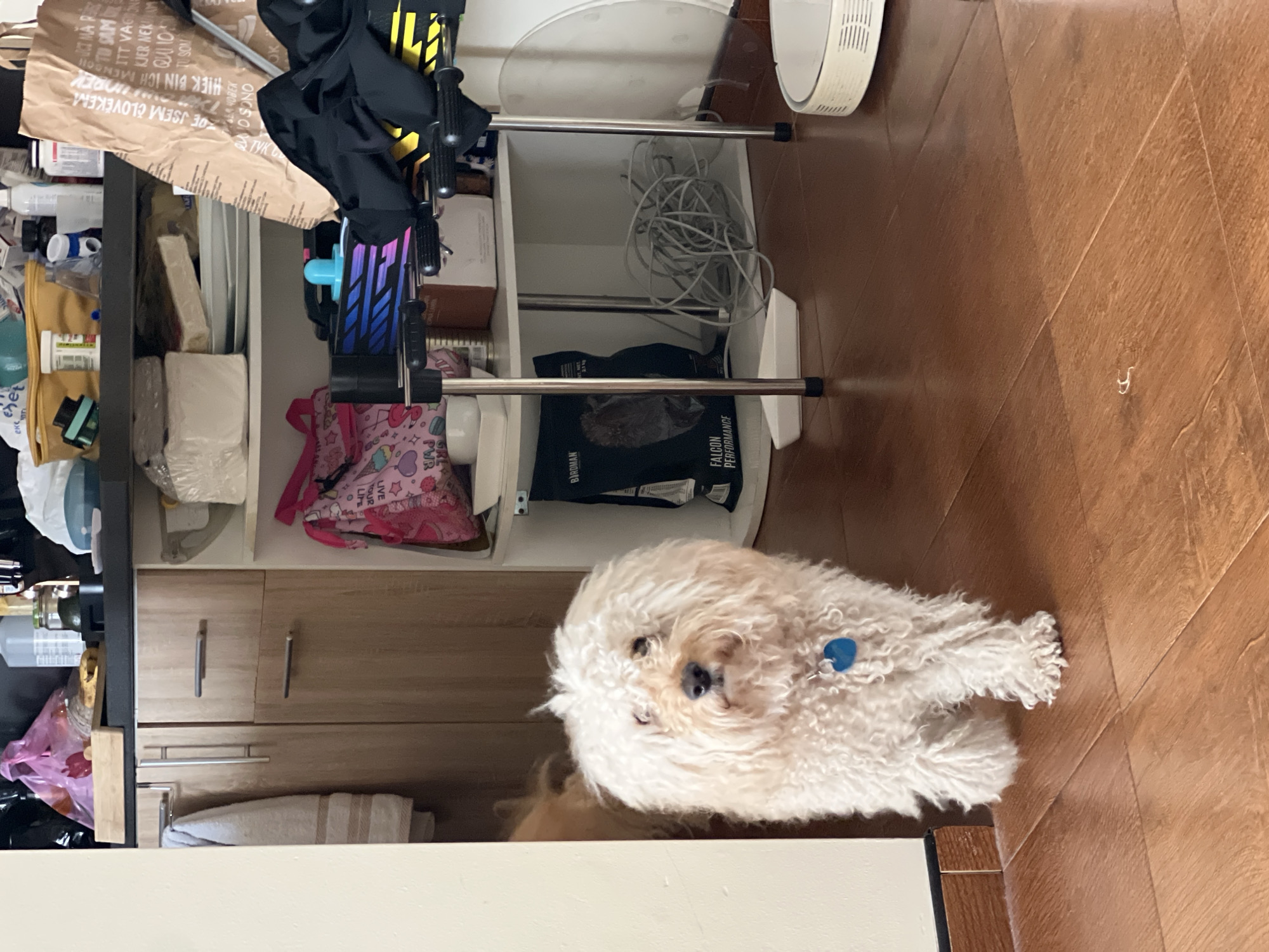 The image depicts an indoor scene within a residence located in Pomorie, Bulgaria. A medium-sized dog with long, curly, light-colored fur and a blue circular tag on its collar is positioned centrally, facing the viewer and appearing to walk forward on a brown laminate or wood-patterned floor. On the floor to the dog's right, a white circular robotic vacuum cleaner is partially visible. A small, twisted white object lies on the floor in the foreground. The background reveals a cluttered interior. To the left, a light-colored wall or doorway frame partially obscures a light-brown wooden cabinet with a grey striped towel hanging from a metal handle. A portion of another light-brown, furry object is faintly visible behind the wall. To the right of the dog, an open shelving unit or counter area displays multiple items. The top surface holds a pink plastic bag, various bottles, jars, a green avocado, a wooden cutting board, and other miscellaneous objects. Below this, a shelf contains stacked white plates and a large brown paper bag featuring foreign text. The next lower shelf holds a black bag labeled "BIRDMAN FALCON PERFORMANCE," a pink bag with "GRL PWR" text, and a blue object resembling a pacifier. Beneath this shelf, a tangle of grey cables is present. On the far right, a metal frame with black handles, possibly part of an exercise machine or storage stand, has black fabric draped over it. A transparent, circular plastic or acrylic sheet leans against the wall behind the metal frame.