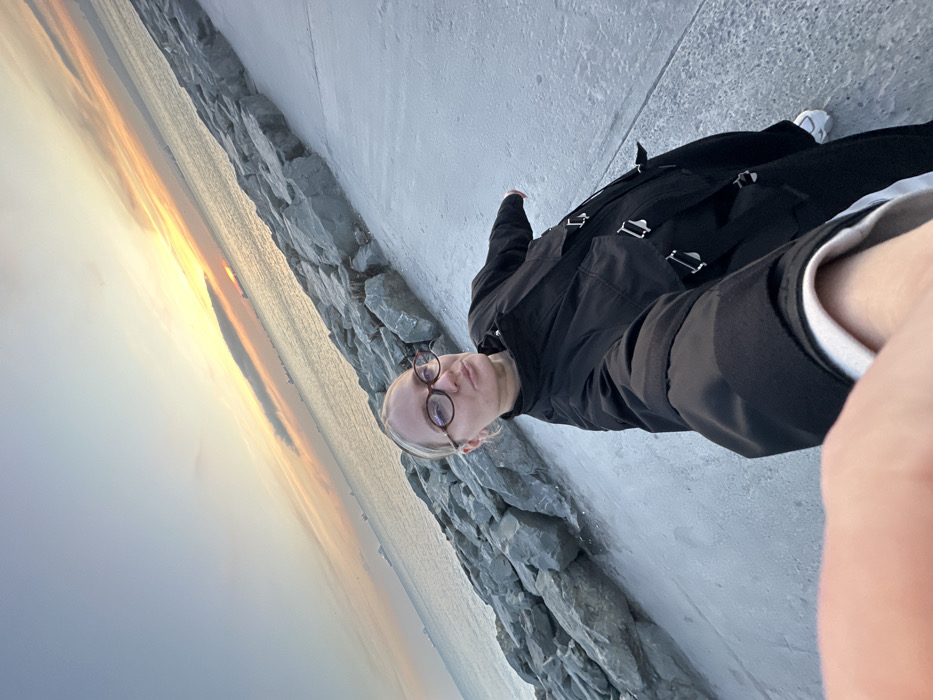 An adult female is depicted in a selfie, taken at the Bakırköy coastline in Turkey during either sunset or sunrise