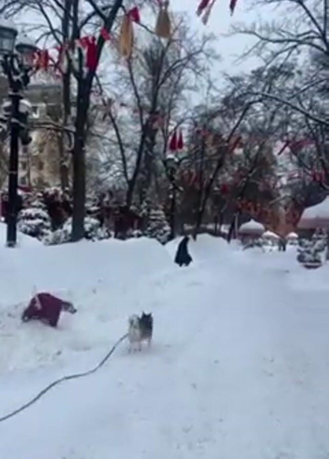 snow-covered park with decorations overhead. Red and gold flags are strung between the bare trees. In the distance, people are walking along the snow-covered path. In the foreground, a Dalmatian wearing a maroon jumpsuit and boots stands in the snow. It is attached to a leash, and a Husky is walking on the other end of the leash.