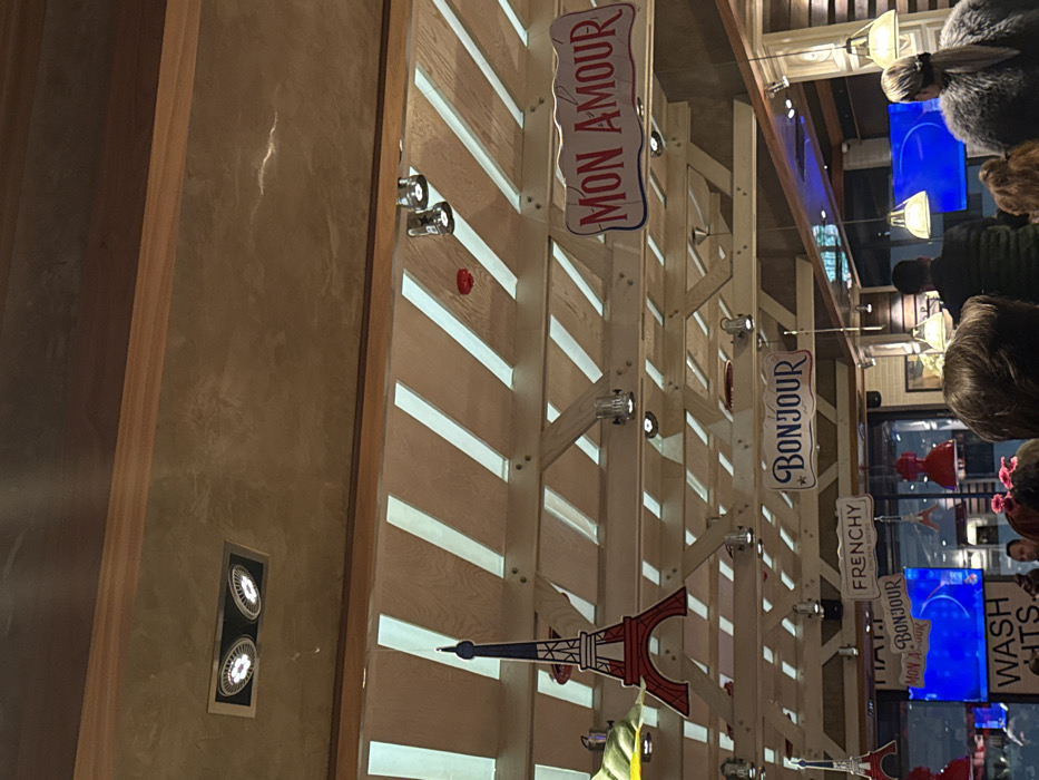 The image displays the interior of the Frenchy Chicken Bistro, located at Bul. "Knyaz Boris I" 170, Varna, Bulgaria. The scene captures a view looking up and across a dining area. The ceiling structure consists of light-colored wooden beams and slats with integrated parallel white light strips. Numerous chrome-finished spotlights, both recessed and surface-mounted, are distributed across this structure. A red, circular smoke detector is affixed to one of the wooden beams. Above this open framework, a darker, possibly beige or light brown, textured ceiling is visible, bordered by darker wooden trim. Various French-themed decorations hang from the wooden ceiling structure. These include a prominent, large cutout of the Eiffel Tower, colored red, white, and blue, positioned on the left side of the frame. Smaller Eiffel Tower cutouts are also visible. Rectangular signs, designed in a vintage style, display text such as "MON AMOUR" in red and white, "BONJOUR" in blue and white, and a smaller sign stating "FRENCHY / CHICKEN BISTRO". In the lower portion of the image, the backs of multiple individuals are visible, suggesting patrons seated within the bistro. On the right, a person with blonde hair tied in a ponytail wears a light grey, textured, possibly faux-fur garment. To their left, another individual wears a dark-colored puffer jacket. In the background, multiple rectangular screens emit a bright blue light. Several hanging pendant light fixtures with white shades are present. A partial sign in the bottom left corner is visible, displaying "WASH ROOMS". The lighting within the establishment is bright, creating a well-lit environment.