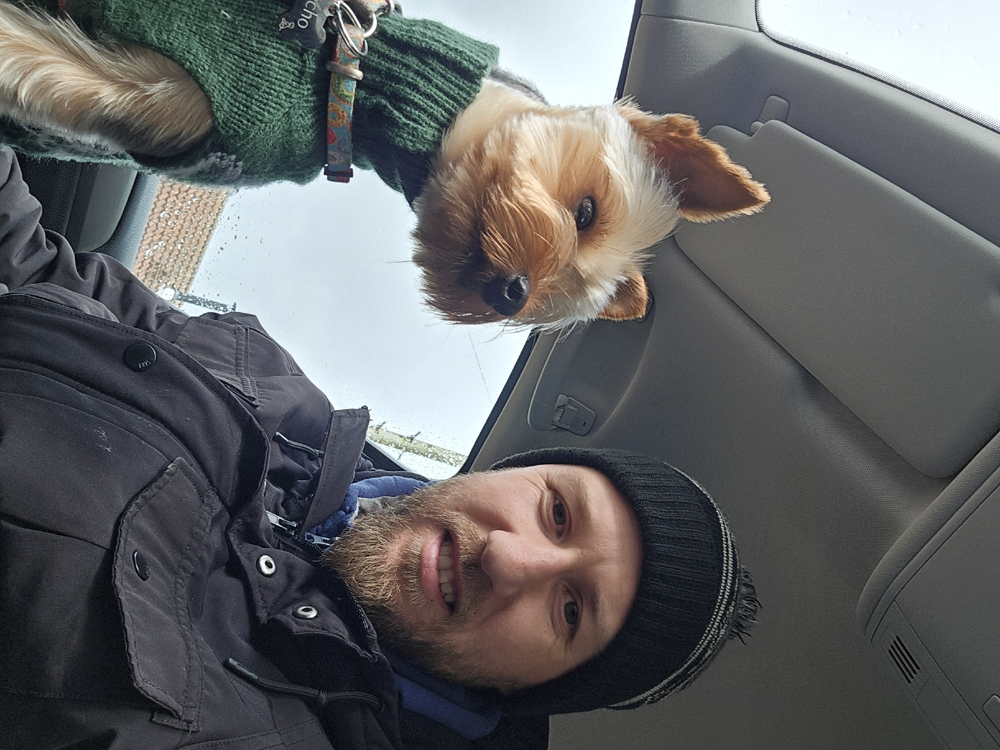 A selfie shows a man with a beard and wearing a black beanie and black jacket in what appears to be the interior of a car. The dog, wearing a green sweater with a colorful leash, is on the roof of the car. The location, St Andrews, United Kingdom, can not be discerned from the details provided in the image.