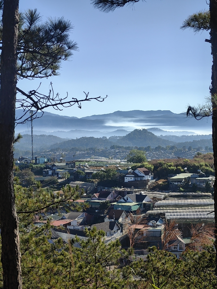 A hillside town nestles below misty mountains under a clear blue sky. Houses with colorful roofs dot the landscape, some interspersed with greenhouses. A distant hillside is covered with many light-colored buildings and trees. The view is framed by tall trees in the foreground, their branches and needles adding depth to the scene.