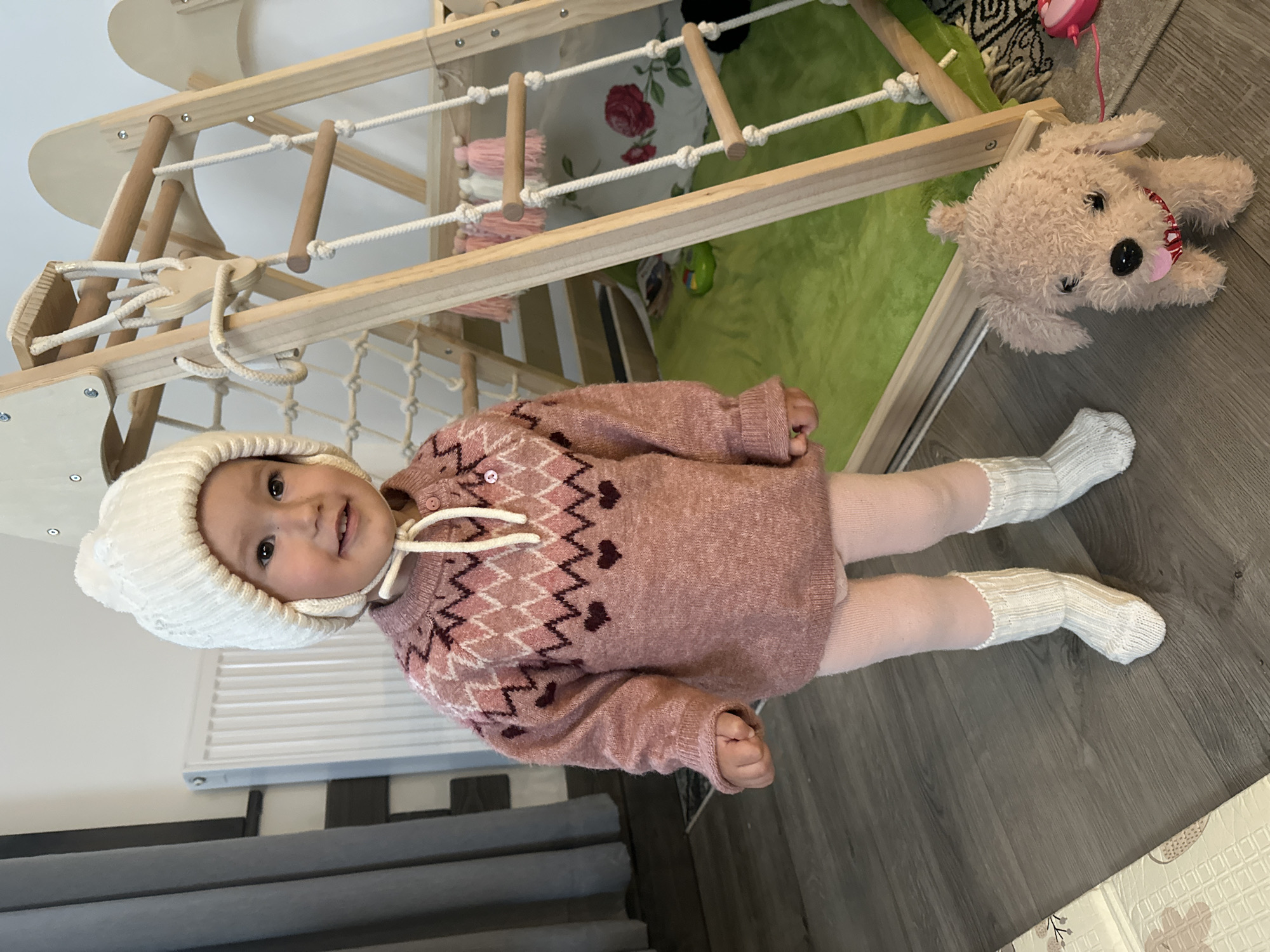 This image depicts an indoor residential scene in the city of Wisła, Poland. The precise location within Wisła, such as a street or building, cannot be determined from the visual information. A single child, appearing to be a toddler, stands centrally in the frame, facing the viewer with a slight turn to the right and a smile. The child wears a white knit bonnet with ear flaps and a pom-pom, secured by ties under the chin. A pink knit sweater, featuring an argyle pattern of white and dark pink diamonds on the upper chest and a row of dark pink hearts across the mid-chest, covers the torso. The sweater has a small two-button placket at the neckline. Below the sweater, the child wears light pink tights and white knit socks. To the child's right, on the wooden floor, is a light brown, curly-textured plush dog toy with black eyes, a black nose, and a red collar with white markings, from which a pink leash extends out of frame. Behind the child and to the right, a multi-component wooden climbing frame is visible. This structure includes an A-frame with wooden rungs and a section with a white rope net. Pink and white tassels hang from a horizontal beam on the frame. A bright green mat covers the floor beneath the climbing frame, partially obscuring a floral-patterned fabric behind it. To the left of the child, a section of dark gray curtains is visible, and further back, a white vertical radiator is mounted on a white wall. The floor throughout the visible area is made of light-colored wood planks, with a patterned, light-colored mat partially visible on the far left.
