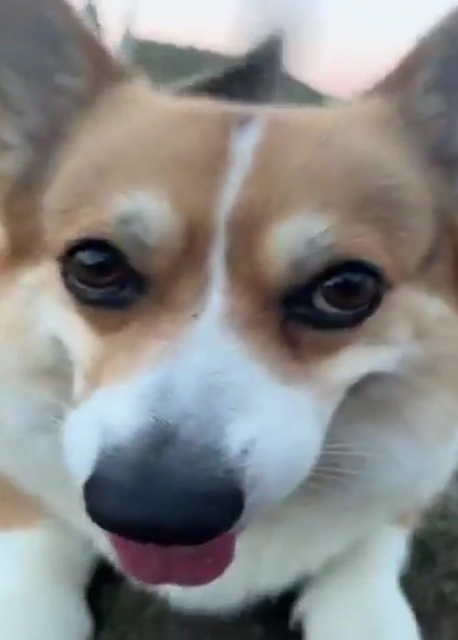 A close-up video shows a tan, white, and black corgi dog barking directly into the camera