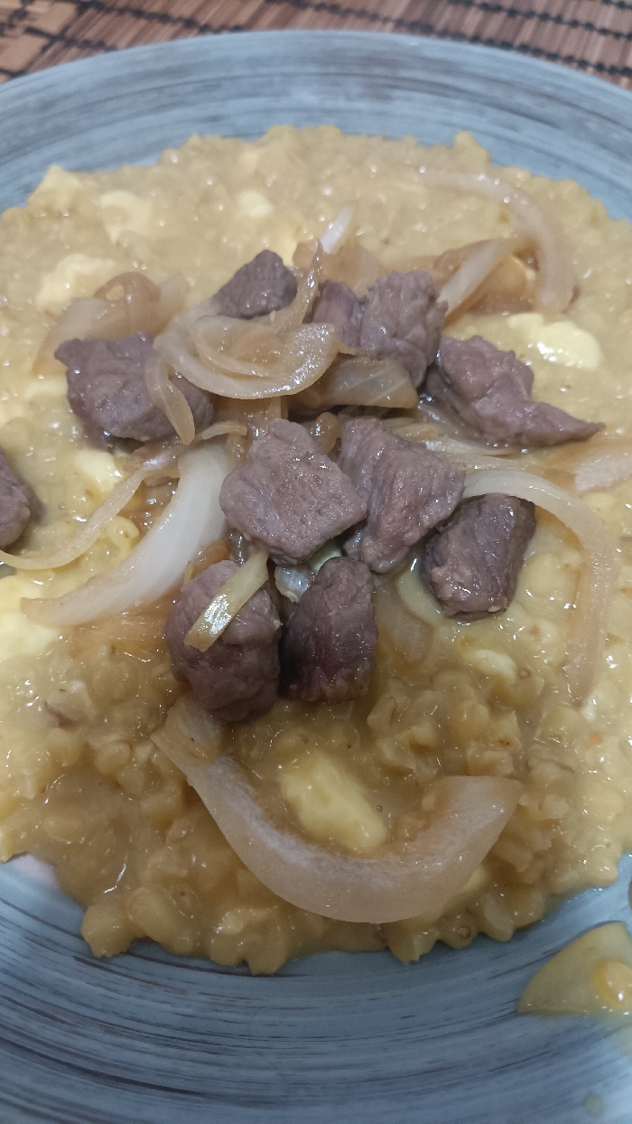 The image presents a close-up, overhead view of a prepared meal served on a light blue ceramic plate, situated in the city of Sagunto, Spain. The dish consists of a viscous, yellowish base, possibly a stew or thick puree, containing embedded lighter yellow, irregular solids. This base is topped with numerous roughly cubic pieces of cooked, brownish-grey meat, alongside several translucent, pale yellow to white slices of cooked onion. The food surfaces appear moist or coated in a sauce. The ceramic plate exhibits subtle, concentric ring patterns. The background is a blurred, dark brown, woven mat surface, indicating an indoor setting, likely a dining table. No individuals or specific actions are depicted.