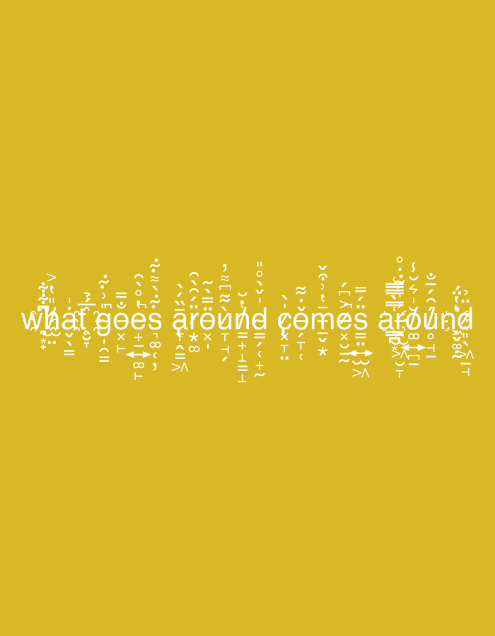 The image displays the phrase "what goes around comes around" rendered in a stylized font. The text is constructed from a collection of symbols, mathematical notations, and typographic characters. These elements are arranged to mimic the appearance of traditional letters, creating a unique and abstract visual representation of the sentence. The text is white and set against a yellow background.
