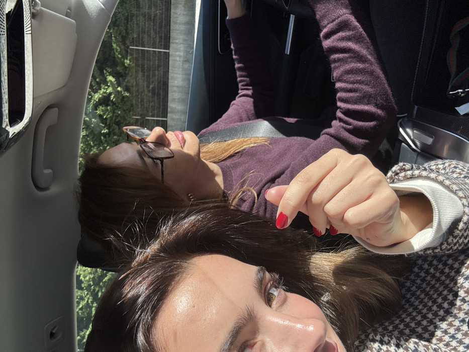 The image captures two females inside a vehicle, likely in Loures, Portugal, under direct sunlight