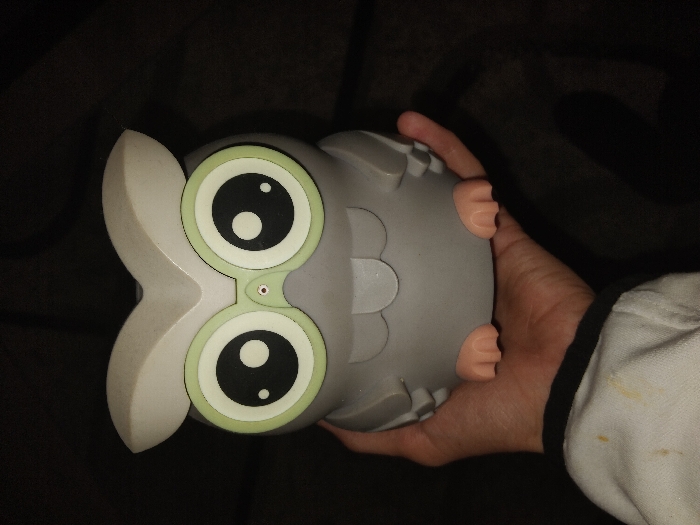 A light gray, stylized owl-shaped object is centrally depicted, held by a human hand. The owl features large circular eyes with light green rims, white irises, and prominent black pupils, each containing a small circular white highlight. A minute reddish-brown circular element is present between the eyes, above a sculpted beak area. Two rounded, ear-like protrusions extend from the top. Its base reveals two small, pinkish-tan, three-toed feet. The object is supported from below by a light-skinned left hand, palm facing upwards. The subject wears a white long-sleeved garment with a dark cuff visible in the lower left corner, exhibiting several yellowish-brown stains on its fabric. The background is uniformly dark and out of focus, providing no discernible environmental details. No information within the image definitively indicates the location as Kazanlak, Bulgaria.