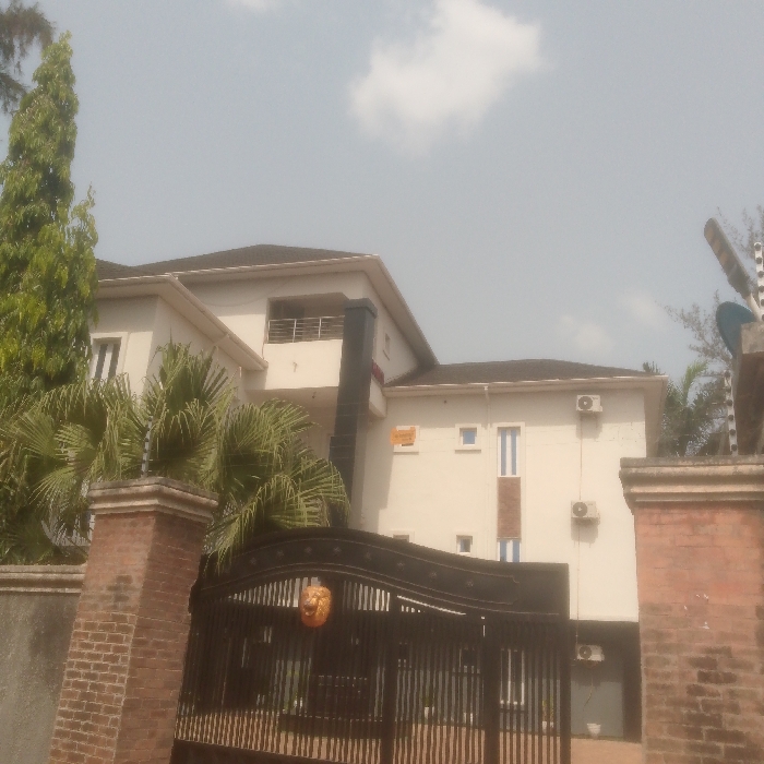 This image displays the exterior of a two-story residential or commercial building in Abakaliki, Nigeria, under a bright, partly cloudy sky