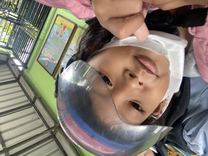 A child wearing a helmet with a clear visor poses for a selfie. A white cloth is tied around their head, covering part of their forehead. The child's face is tilted slightly. Outside, a building with a green wall and framed pictures is visible. A metal awning covers a set of stairs or seating. The overall image is oriented vertically and appears to be taken at an unusual angle, looking up at the child.