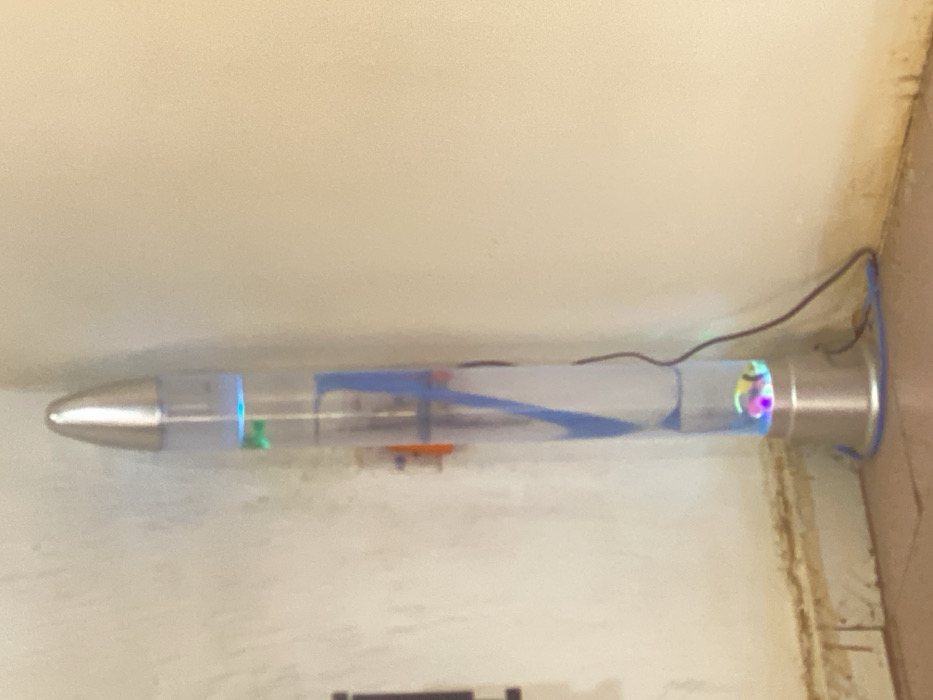 - "A tall, cylindrical, rocket-shaped water lamp with a silver conical top and a silver circular base stands in the corner of a room in Narayi, Nigeria" by FM-qtG7Q2, licensed under CC BY 4.0