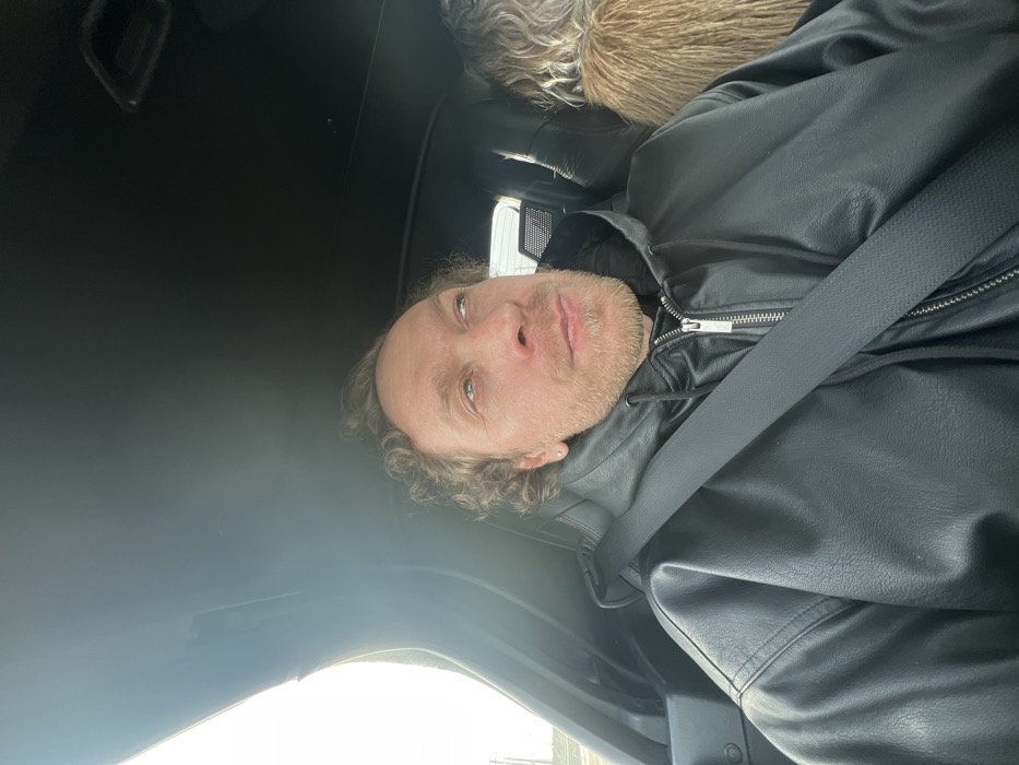 A male individual is depicted in the foreground, seated within the dark interior of a vehicle in Novosaratovka, Russia. The male occupies the left two-thirds of the frame, positioned as if in the driver's or front passenger seat. He has light skin, short curly light brown hair, and a light-colored beard or stubble. A small silver stud earring is visible in his left earlobe. His eyes are blue, and his gaze is directed upwards and to the right of the frame, with a closed mouth and neutral expression. He is wearing a black leather-look jacket with a prominent silver zipper, beneath which a dark hooded garment is visible. A dark-colored seatbelt diagonally traverses his chest. To the right of the male subject, a mass of long, shaggy, light brown or tan fur, consistent with an animal, is partially visible. The vehicle's interior roof and pillar structures are dark-colored. Through the left-side window, an intensely bright, overexposed exterior is visible, indicating daylight conditions, with sparse, indistinct vertical elements in the distant background.