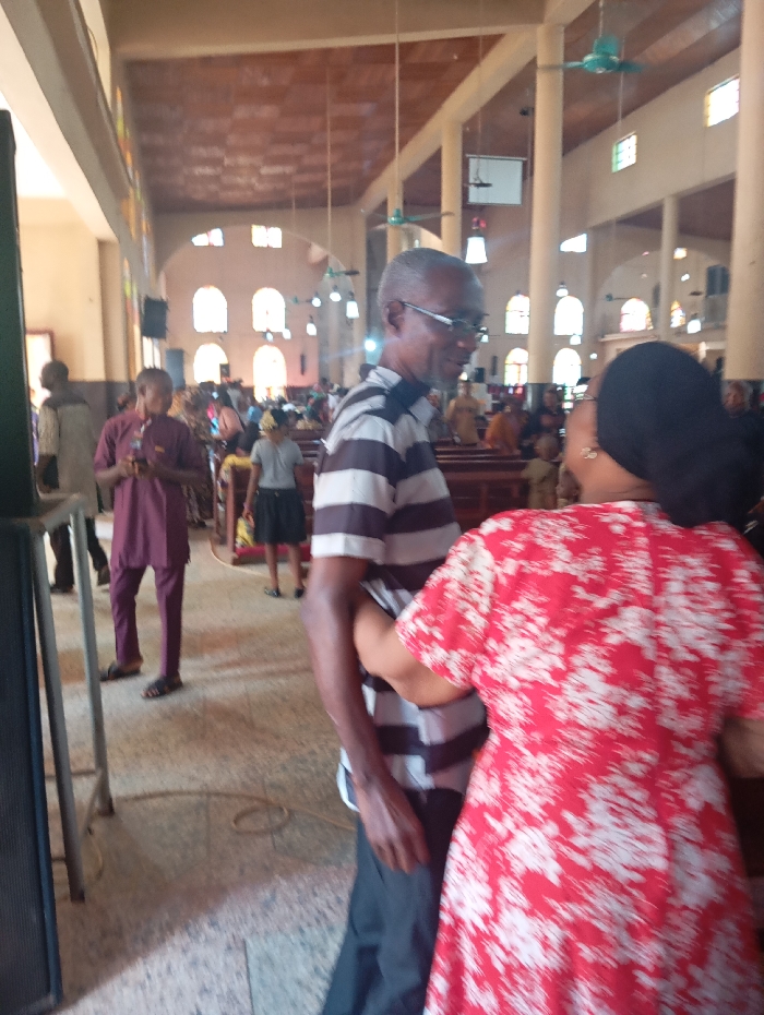 In a church setting, an older man with glasses and a striped shirt stands beside a woman in a red and white floral dress and a black head covering. They appear to be engaged in conversation. Various other people, dressed in a range of attire, mill about in the background, including a person in a maroon outfit and a child in a skirt. Church pews are visible, and the architecture includes high ceilings, columns, and arched windows. Ceiling fans hang overhead.